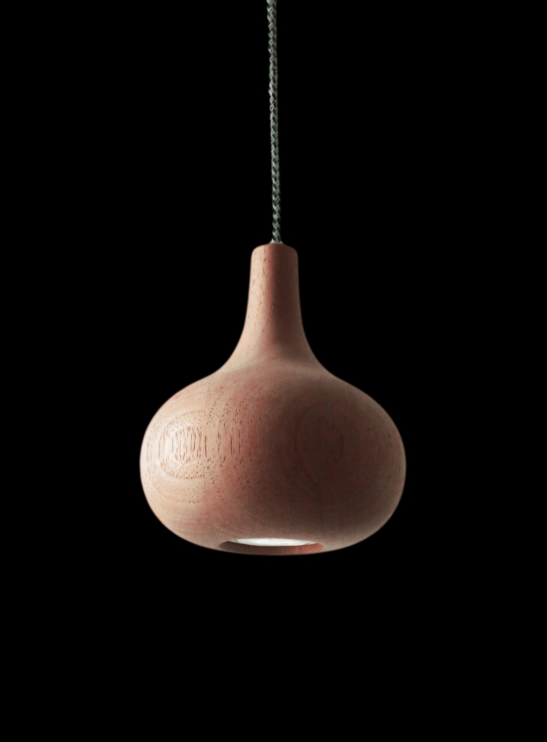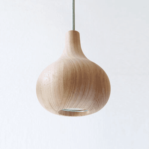 Colgante con cuerpo en madera de cedro torneada a mano, base a techo níquel mate 15 cm y cable textil 15 cm. Dimensiones: ø12,5 x 15,5 cm