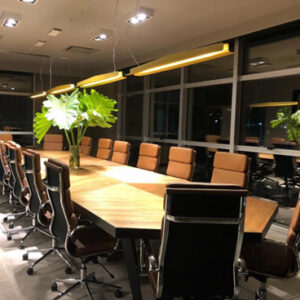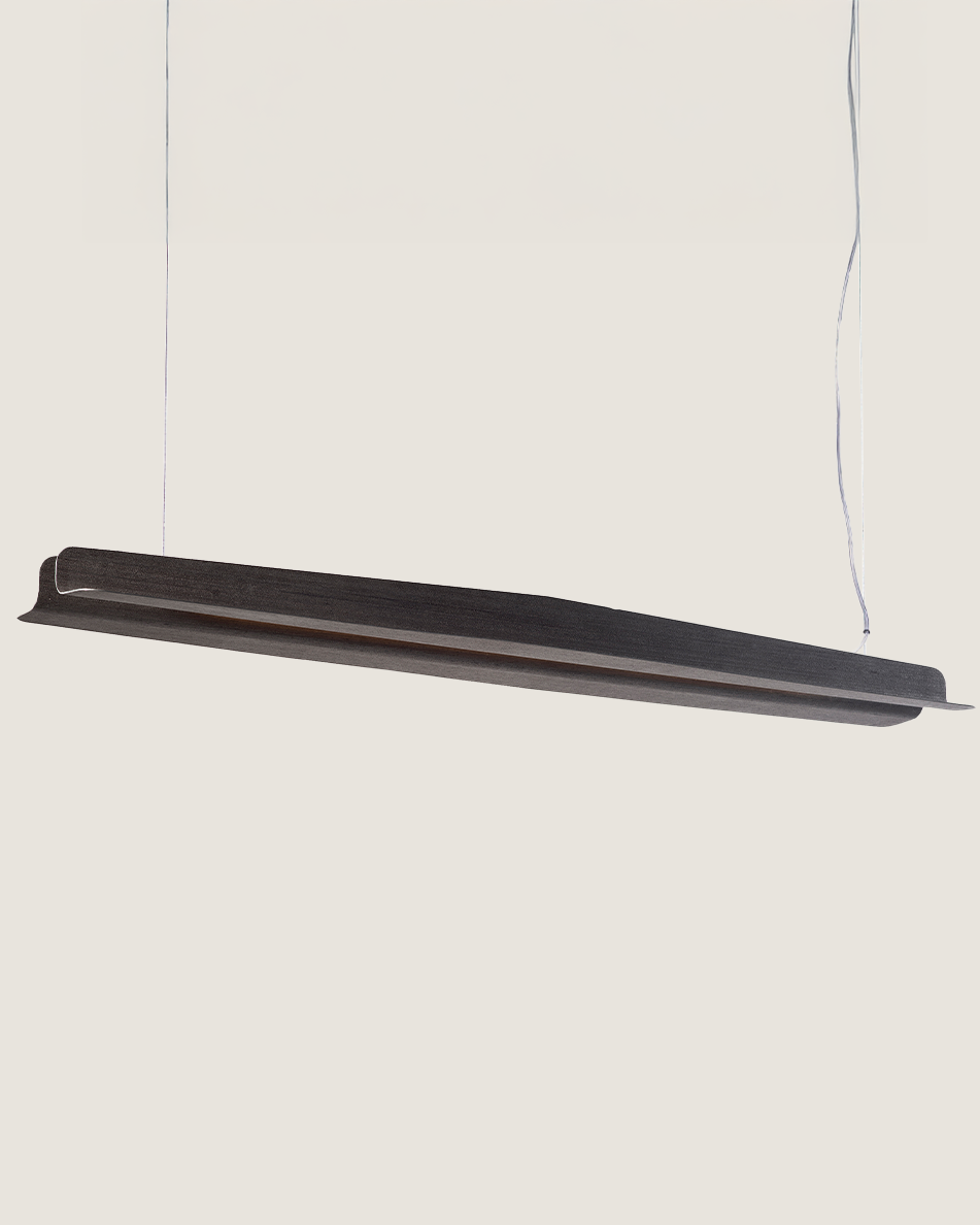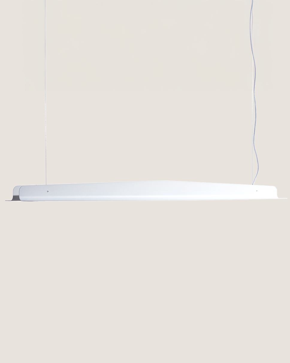 Lámpara de suspensión de luz directa. Aletas de aluminio o de acero. Tensores de suspensión de acero galvanizado. Difusor de metacrilato esmerilado. Cable eléctrico transparente. Florón porta-driver.