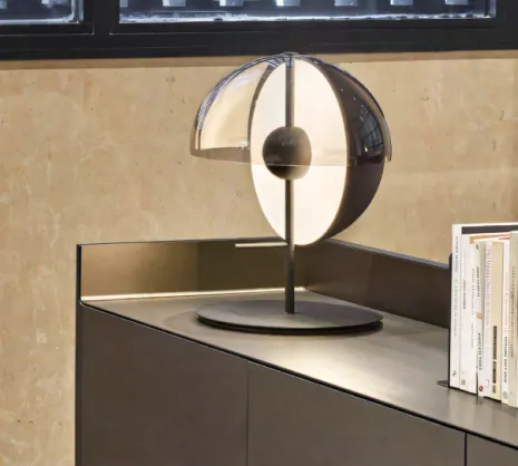 Lámpara de mesa con LED 11W y regulación táctil. Su diseño combina formas geométricas con un juego de luces y sombras gracias a su pantalla orientable. Terminación en gris Taizi con vidrio a tono. Fabricada en acero al carbono, aleación de aluminio y vidrio.