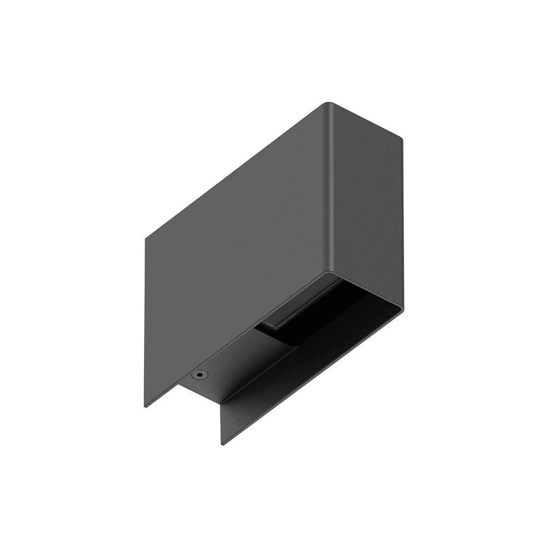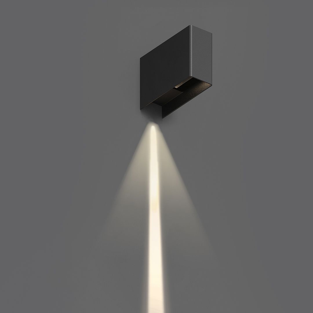 Aplique de pared exterior con cuerpo de aluminio texturado y difusor de vidrio templado, con distribución lineal descendente. Dimensiones: 6 x 12,5 x 17 cm Potencia: 11W Temperatura de color: 3000°K