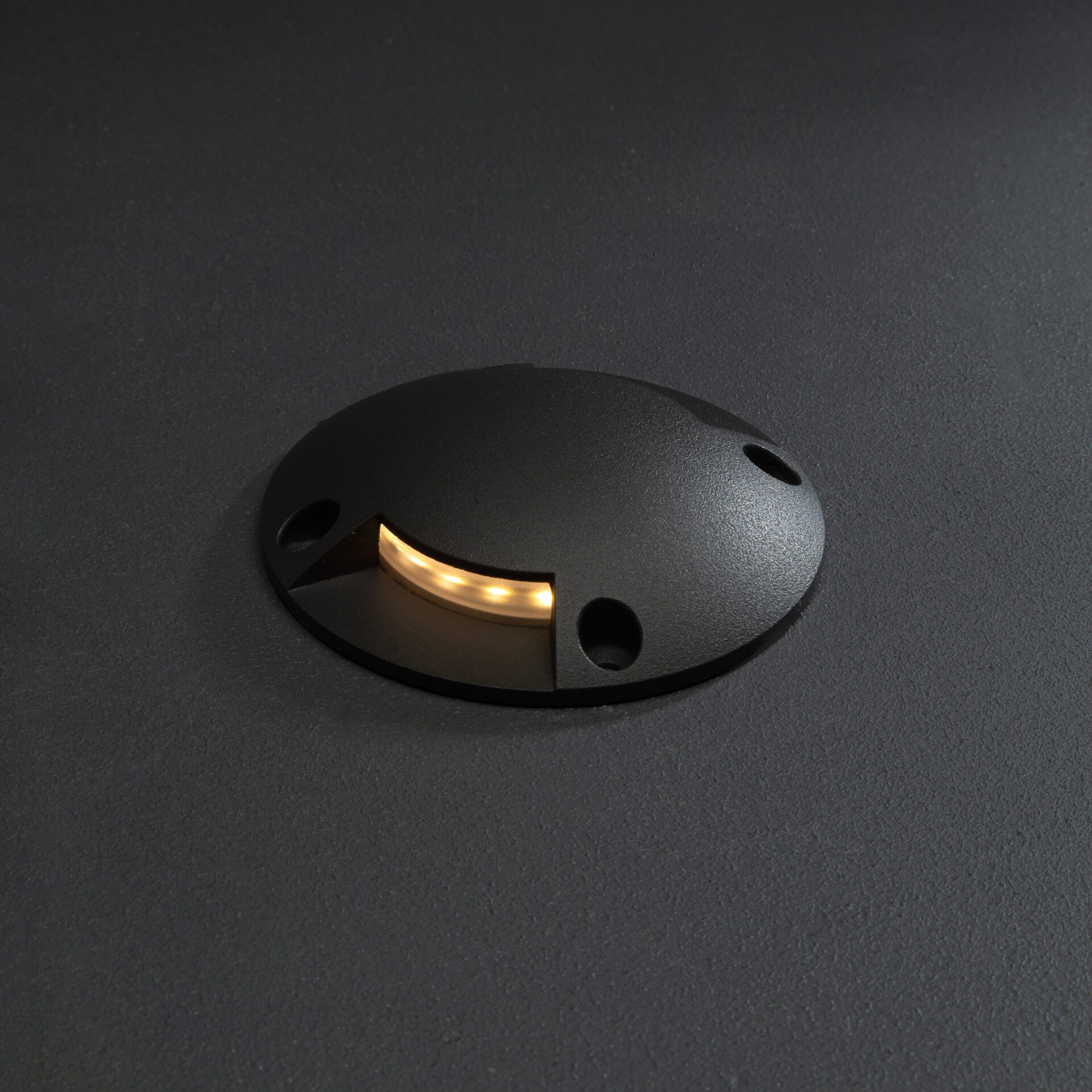 Luminaria de exterior Aplicable en piso. Potencia del sistema:0.6W Temperatura de color:2700°K Color del artefacto: Gris grafito Dimensiones:Ø 8,5cm x 2cm