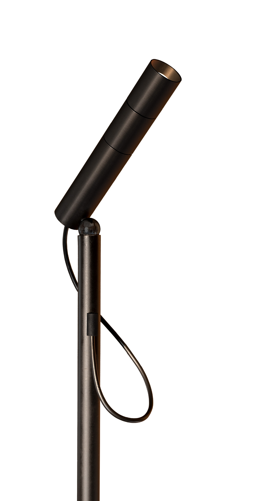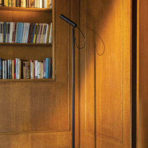 Lámpara de pie de diseño sofisticado y técnico. Proporciona una iluminación óptica y directa avanzada, por su esféra magnética que une el cuerpo con el spot, permitiendo ajustar el ángulo del cabezal, además de su intensidad.