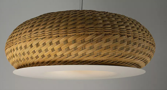 Lámpara de suspensión de luz semi directa. Cuerpo en tejido de fibra natural «simbol» hecho a mano y disco de aluminio. Tensores de acero galvanizado y cable blanco o negro. 1x E27 LED. Medidas: 63×26 cm